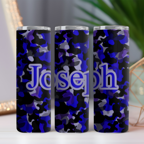 The Camo Blue Tumbler is made of stainless steel and features a double-wall, vacuum insulated design. It is available in two sizes – 20-oz. and 30-oz. – and comes individually boxed with a clear sliding lid and straw. It is BPA free and coated for sublimation, making it an ideal personalization choice.